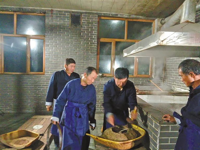 一道完整的錘打麻油制作,從選料便盡顯嚴苛。先用風車篩選胡麻籽,將土塊、秕子、石塊等雜質徹底清除,確保原料純凈;隨后,將精選的胡麻籽放入大鍋中翻炒,高溫既能破掉胡麻籽的細胞結構,又能激發(fā)內在醇香,“噼啪”的爆裂聲中,濃郁的香氣便在作坊中彌漫開來;炒好的胡麻籽倒入笸籮翻晾,待完全晾涼后,用石磨研磨成粉,然后加水攪拌成散狀,再經高溫蒸制充分軟化,為包坯進榨做好準備。