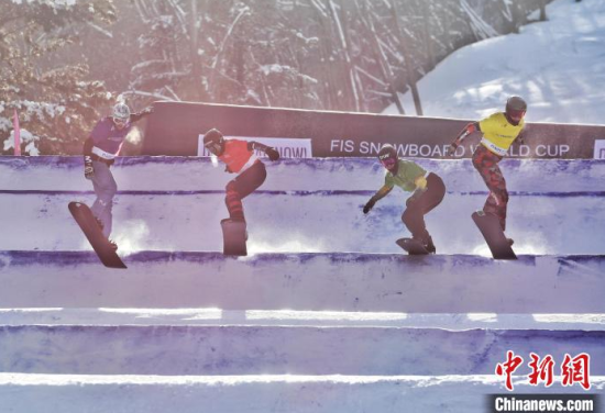 2月2日,2024—2025賽季國際雪聯(lián)單板滑雪障礙追逐世界杯北大湖站迎來收官?zèng)Q賽。圖為選手們正在比賽!≈行律缬浾 石洪宇 攝