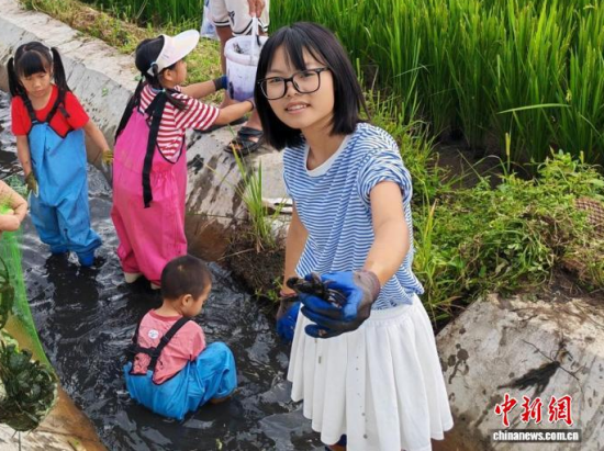 8月11日,2025年吉林省臺聯(lián)第五屆兩岸婚姻家庭親子夏令營走進吉林市,營員們在稻田體驗抓螃蟹!↑S子珊 攝