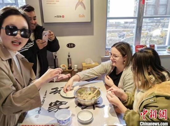 圖為外國(guó)留學(xué)生在山東煙臺(tái)學(xué)習(xí)包鲅魚水餃!≈行律缬浾 李長(zhǎng)亮 攝