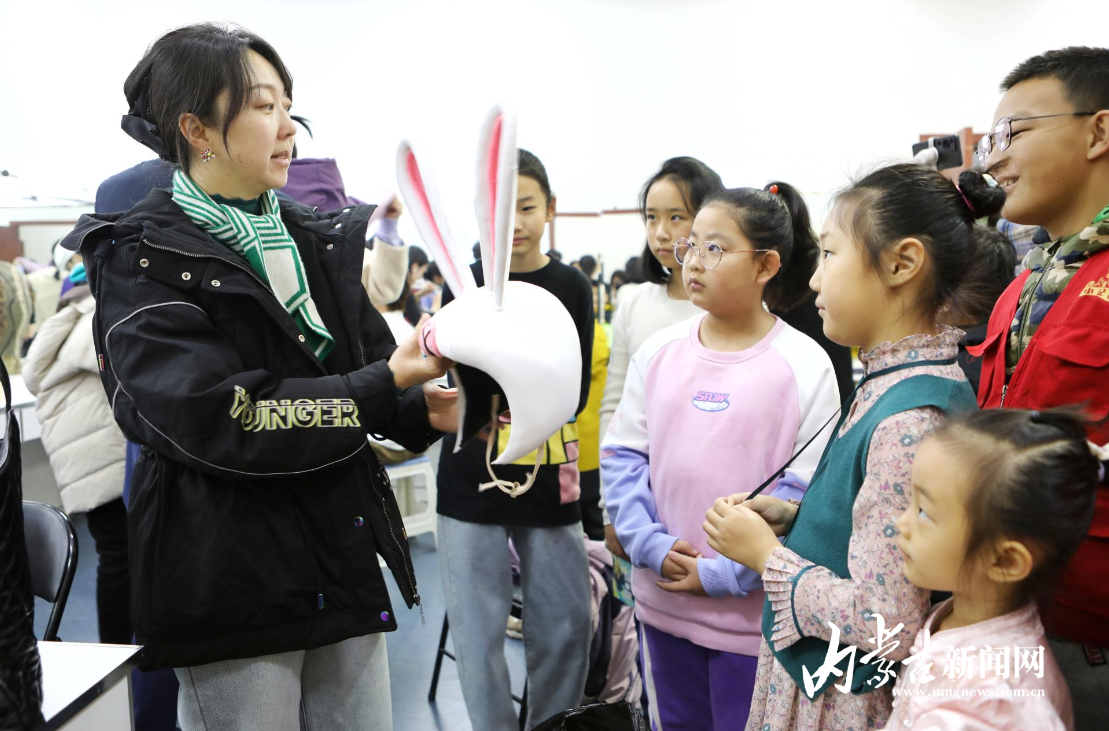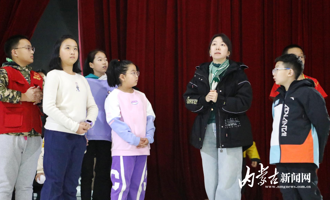 “我想體驗(yàn)馬的道具”“我想試試兔子的道具”……當(dāng)日,在《十二生肖“斗天狗”》正式演出前,小記者們來到呼和浩特民族劇場后臺,看了演員化妝和換裝過程,部分小記者還試戴演出道具。工作人員又帶領(lǐng)大家走上舞臺,參觀舞美布景和道具的工作區(qū)域,以及座位布局、燈光系統(tǒng)等設(shè)施,了解幕后工作人員是如何精心打造每一個(gè)場景的。