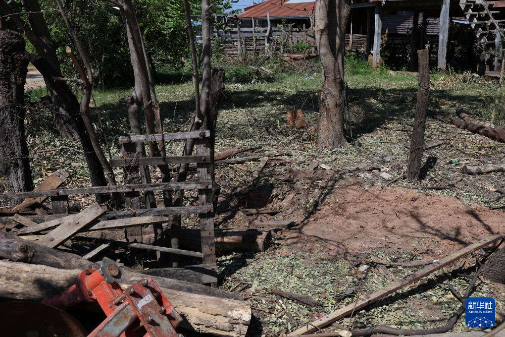 這是12月29日在泰國沙繳府臨近柬埔寨的邊境地區(qū)拍攝的一處民居旁的彈坑。