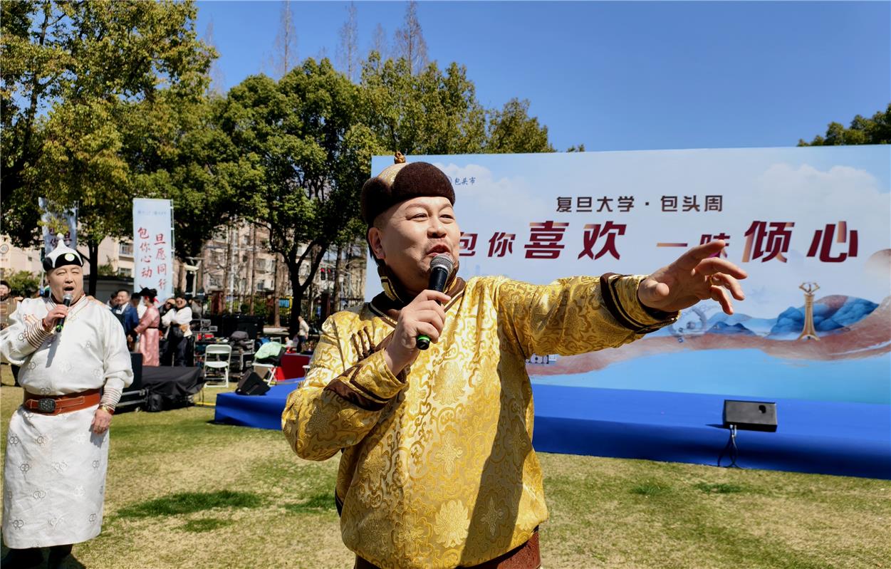 人群中,一位抱著書本的女生踮起腳尖,試圖看清那個拉著馬頭琴的身影?!度f馬奔騰》的旋律從琴弦上奔涌而出,琴弓起落間,仿佛有千軍萬馬從草原踏過。她掏出手機(jī),鏡頭拉近——演奏者身著蒙古袍,神情專注,琴聲穿過春日的梧桐葉,在校園里回蕩。這是包頭市藝術(shù)劇院走進(jìn)復(fù)旦大學(xué)的第三天。