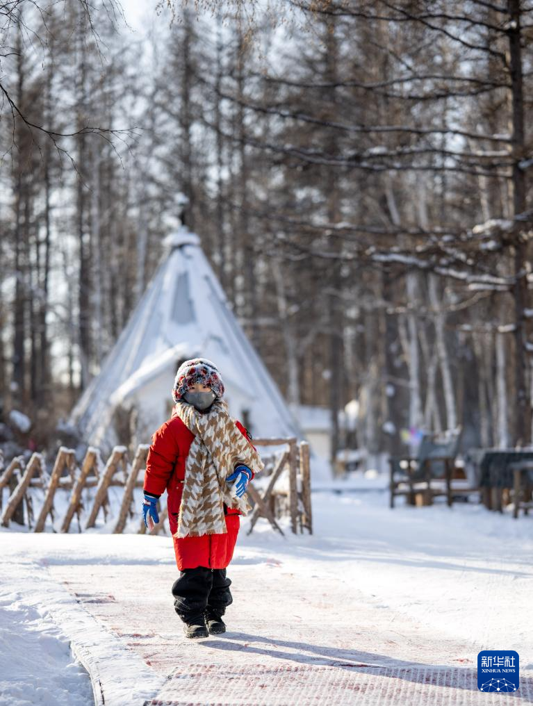 1月15日,一名小游客在根河市敖魯古雅鄂溫克民族鄉(xiāng)游玩。