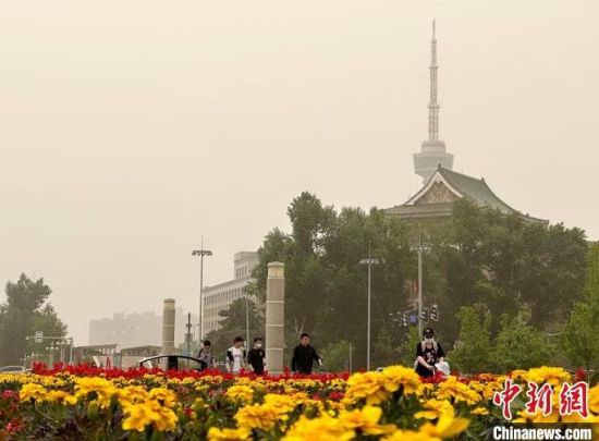 長春文化廣場雕塑!」选z市民在公園散步!」选z城市上空昏黃一片!」选z沙塵天氣使能見度降低。 郭佳 攝城市綠樹被沙塵籠罩。 郭佳 攝